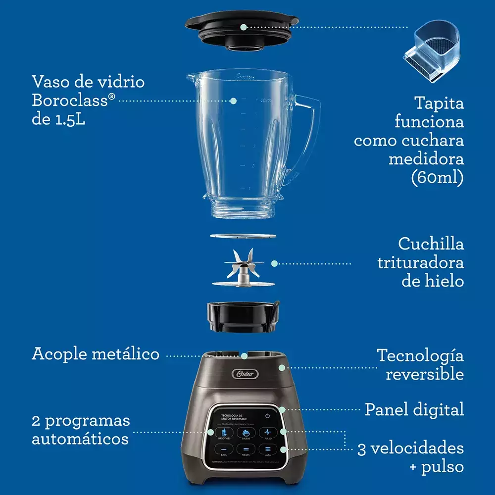 La licuadora Oster con tecnología reversible te ofrece una experiencia de licuado superior gracias a su potente motor de 1000W, su panel digital intuitivo y programas automáticos que se adaptan a tus necesidades. Su vaso de vidrio resistente de 1.5L y sus 6 cuchillas aseguran mezclas suaves y homogéneas en segundos. Ideal para quienes buscan practicidad, tecnología y resultados impecables en la cocina. 🥤