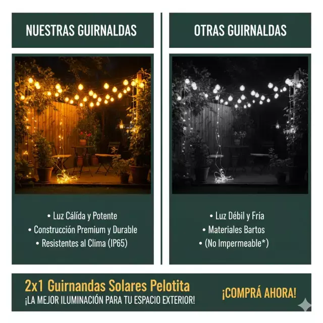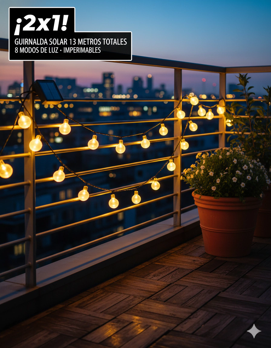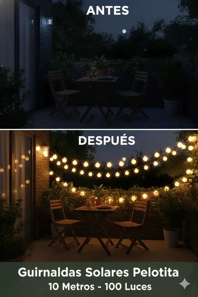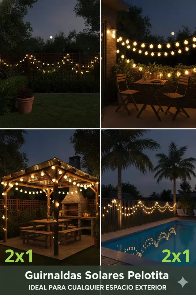 Imaginate llegar a casa después de un día largo, salir al jardín y que te reciba una lluvia de luces cálidas, creando el ambiente perfecto para una copa de vino, una cena romántica o una charla con amigos. Con nuestras Guirnaldas Solares Esferas (Pack 2x1), esa atmósfera de "revista de decoración" está al alcance de tu mano.