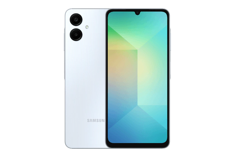 Conocé el **Galaxy A06 (4G) 64 GB**, disponible en los tonos **Light Blue**, **Light Green** y **Black**. Funciona con el procesador **MediaTek Helio G85**, pantalla **PLS LCD de 6,7″ HD+ (720 × 1600)** con frecuencia de **60 Hz**, y una batería de **5 000 mAh** con carga rápida de **25 W** para un uso largo y eficiente.